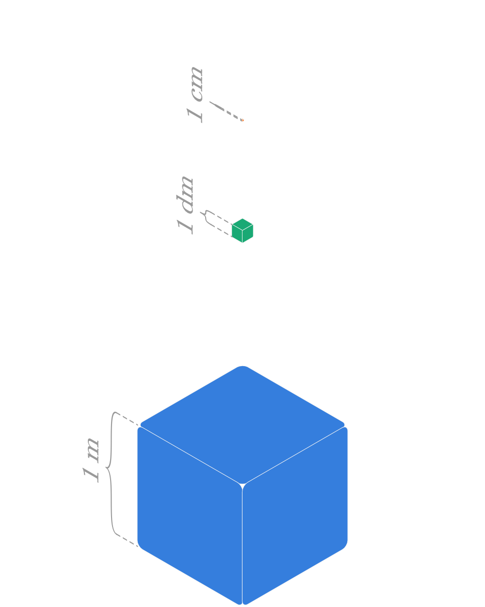 We weten dat de inhoud van één van deze kubussen exact gelijk is aan 1 liter. Als je je nu bv. een typisch brik melk van 1 liter inbeeldt, dan zou één van onze kubussen hetzelfde volume moeten hebben als dat brik. Je ziet dat de kubus met een volume van het meest gelijkaardig is: