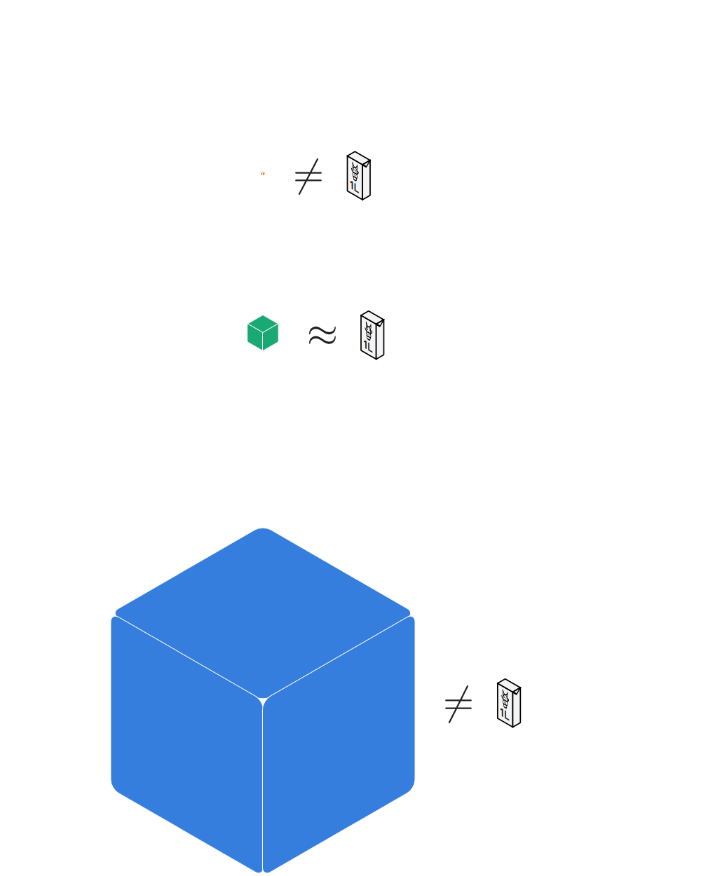 Meer zelfs: het volume van die kubus en het brik melk is identiek hetzelfde. Je zou het brik melk volledig kunnen leeggieten in de kubus van en dan zal de kubus volledig tot aan de rand gevuld zijn.