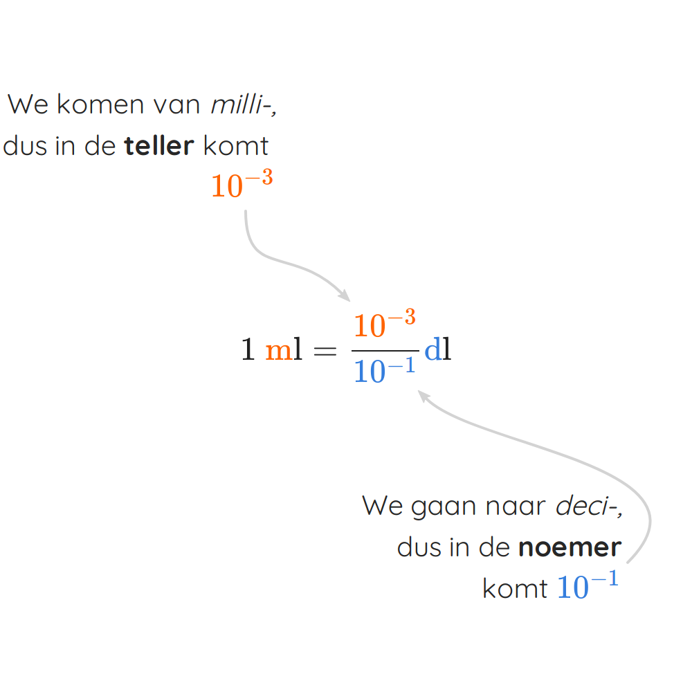 We willen omzetten naar We vertrekken dus van milli- en gaan naar deci-. Ons trucje zegt dat we dan op de puntjes een breuk moeten zetten met in de teller de macht van 10 die hoort bij milli- en in de noemer de macht van 10 die hoort bij deci-. Uit de tabel van hierboven halen we dat bij milli- de macht hoort en bij deci- Als we deze breuk invullen op de plaats van de puntjes, vinden we: