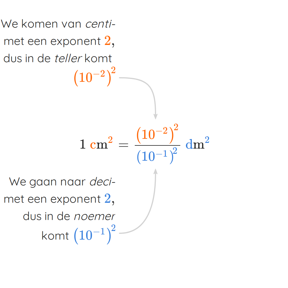 We weten ondertussen al dat we voor het omzetten van eenheden telkens moeten weten waar van de ene eenheid gelijk aan is in de andere eenheid. In deze paragraaf leren we een trucje om dit te berekenen voor omzettingen van eenheden met exponenten. Dit komt voornamelijk voor bij oppervlakte- en inhoudsmaten zoals en