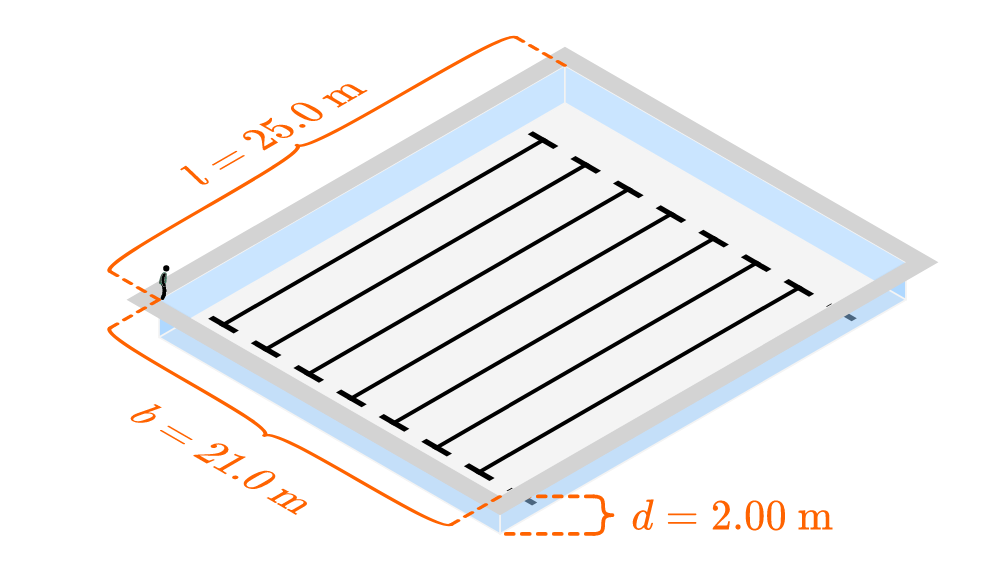 Het volume van het zwembad kunnen we vinden door de lengte, breedte en diepte met elkaar te vermenigvuldigen: