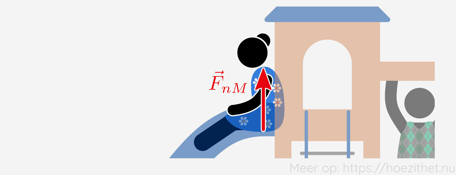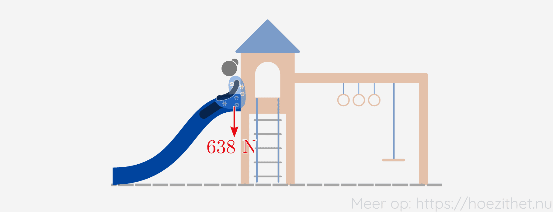 De zwaartekracht trekt Maria naar beneden. Hierdoor oefent ze een gewicht uit op de glijbaan. Er zijn geen andere krachten die Maria tegen de glijbaan trekken. Daarom is de grootte het gewicht dat ze uitoefent op de glijbaan gelijk aan de grootte van de zwaartekracht op Maria.