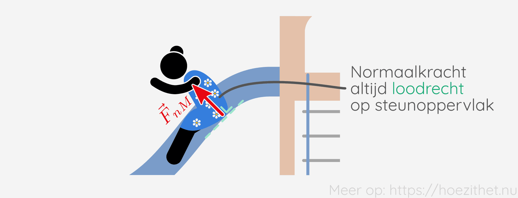 De normaalkracht is "normaal" omdat ze altijd loodrecht op het steunoppervlak staat (normaal is een ander woord voor loodrecht). Ook wanneer het steunoppervlak schuin staat, staat de normaalkracht er loodrecht op.