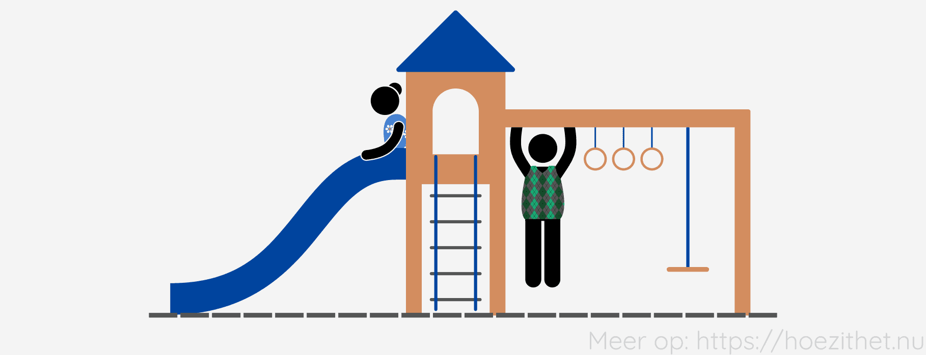 Stel dat Maria en Dirk zich wagen aan een bezoekje aan de lokale speeltuin. Maria zet zich op de glijbaan en Dirk gaat aan het klimrek hangen.