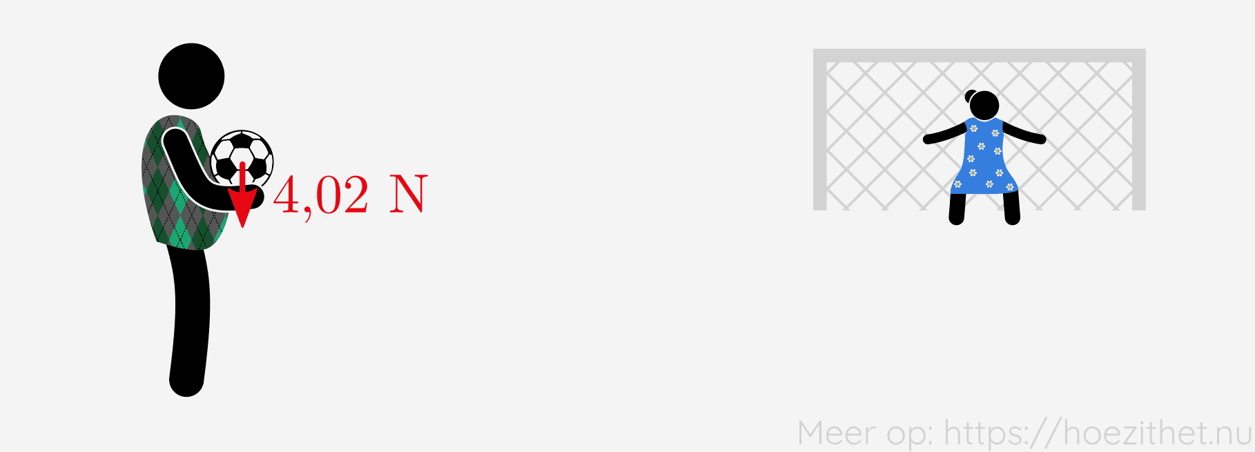 De voetbal heeft een massa van . Welke kracht voelt Dirk als hij de bal vasthoudt op aarde?