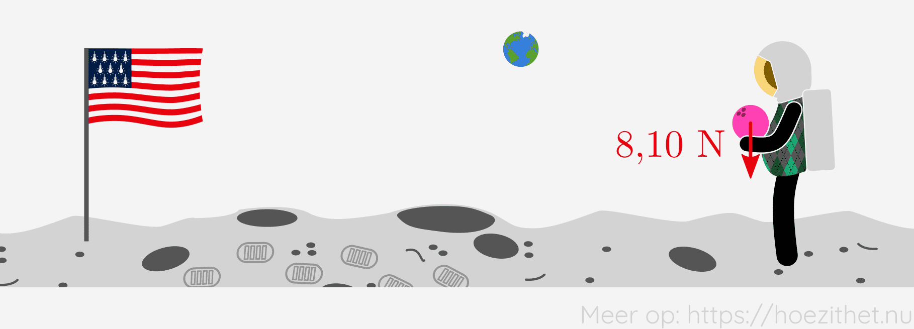 Dirk gaat nu naar de maan en houdt daar dezelfde bowlingbal vast. Welke kracht voelt Dirk nu? Neem .
