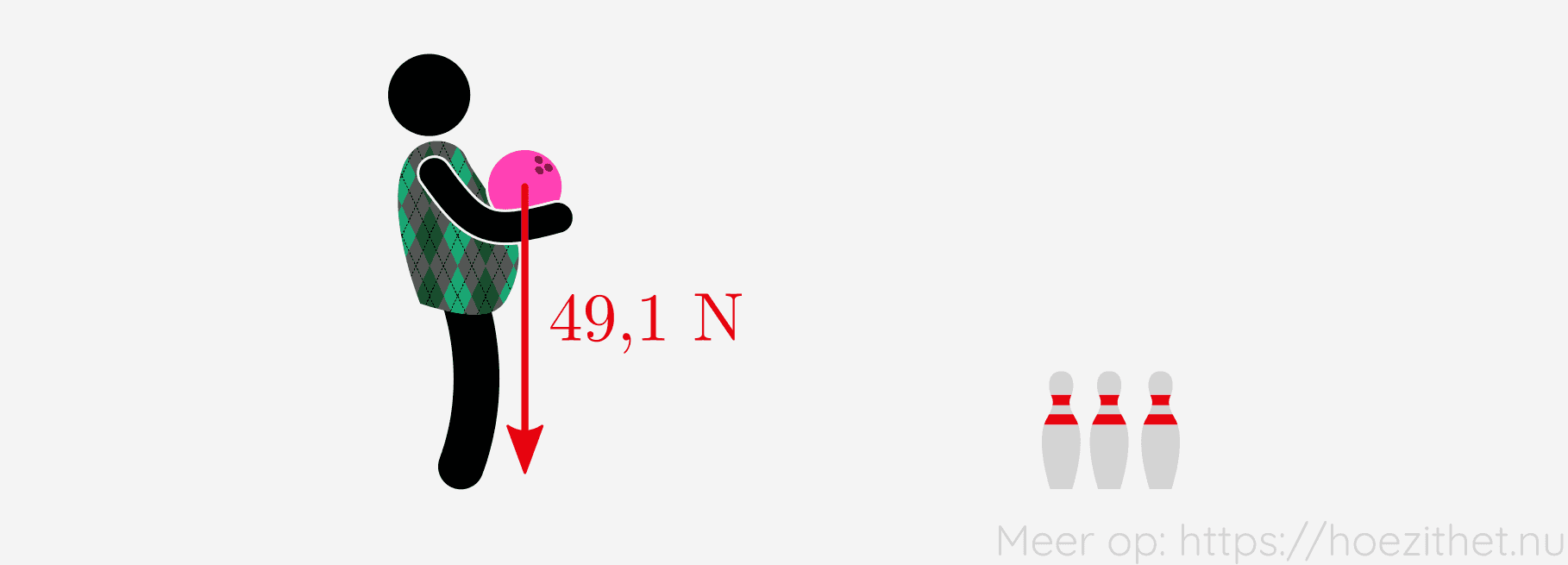 Stel dat onze bowlingbal een massa heeft van . Welke kracht zal Dirk dan voelen wanneer hij de bal vasthoudt op de aarde? Neem .