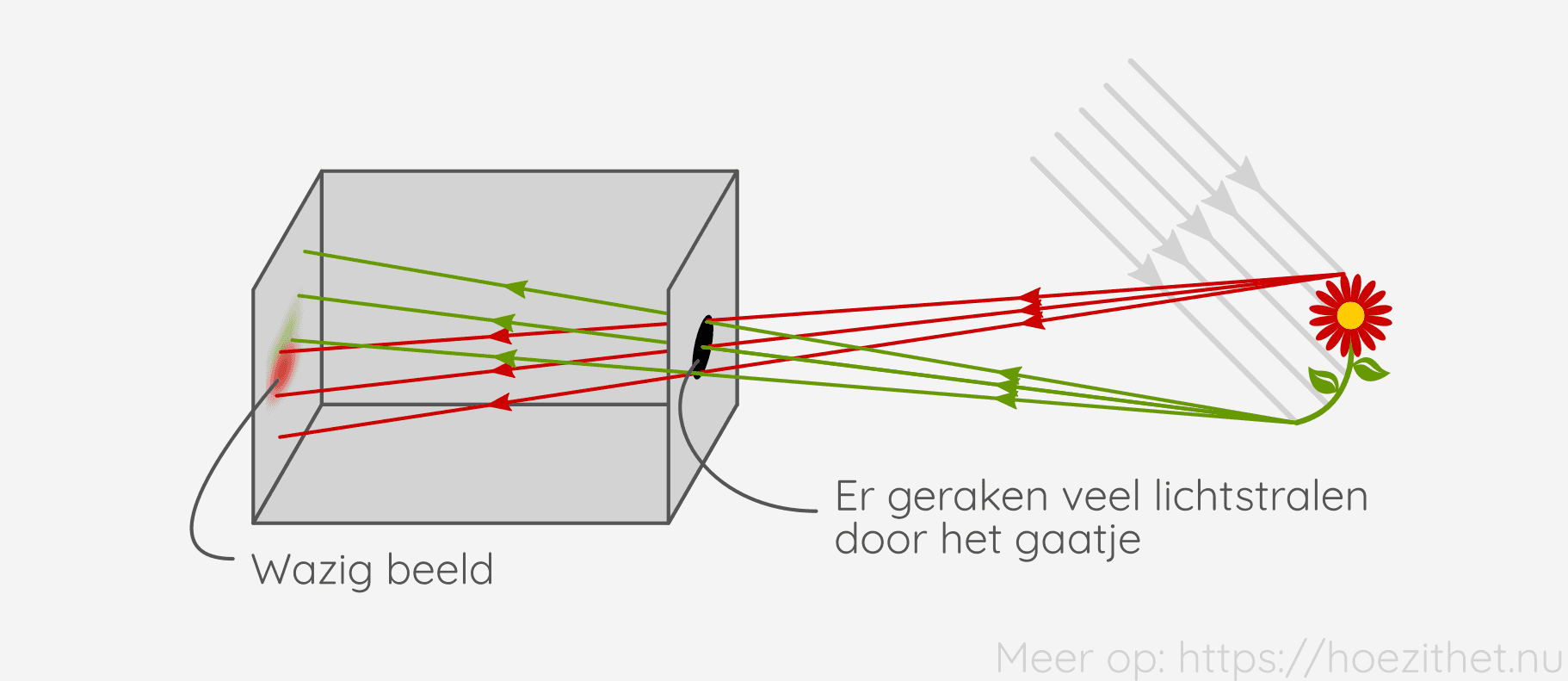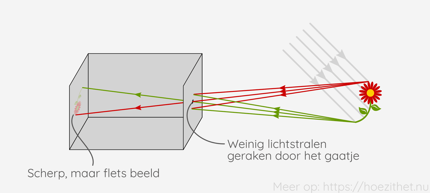 Omdat het gaatje zo klein is, zijn er heel weinig lichtstralen die tot de overstaande wand geraken en mee het beeld vormen. Daardoor is het beeld heel flets. We zouden dat kunnen tegengaan door het gaatje te vergroten, maar dan zal het beeld onscherp worden.