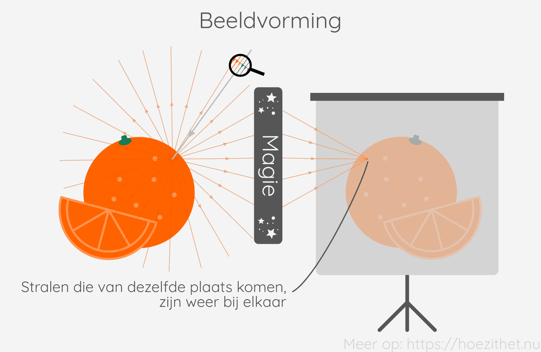 Gelukkig is dat wel mogelijk, anders konden onze ogen nooit werken. Beeldvorming is het samenbrengen van lichtstralen die vanuit dezelfde plaats vertrokken zijn. Als we een scherm plaatsen op het punt waar de lichtstralen zijn samengebracht, zien we op dat scherm een afbeelding van het voorwerp (bv. de sinaasappel).