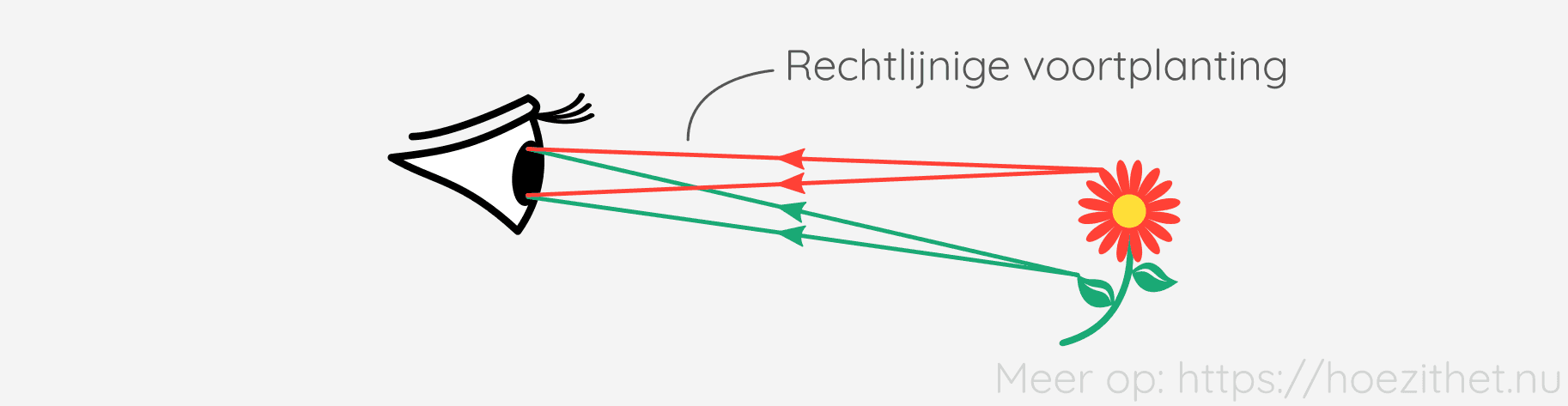 Lichtstralen die door de lucht vliegen van een bloem naar jouw ogen, zullen dat in een rechte lijn doen. De middenstof is homogeen en de lichtstralen zullen zich dus rechtlijnig voortplanten.