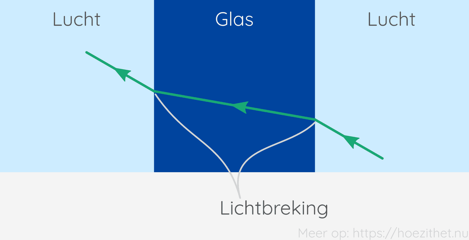 Lichtstralen lijken te breken bij de overgangen van lucht naar glas en van glas naar lucht. Dit fenomeen noemen we lichtbreking en zullen we later nog uitvoerig bespreken. De lenzen in ogen, brilglazen, camera's, telescopen en projectors maken handig gebruik van lichtbreking om een beeld scherp te stellen.