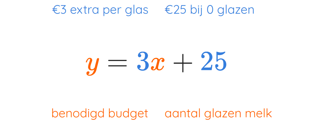 Hoe komt het dat de voorbeelden van Dirk die naar een festival gaat, van Maria die pralines eet en van bevroren soep die opgewarmd wordt allemaal leiden tot een functie van de eerste graad? Wel, per extra glas melk kwam er een vast bedrag van €3 bij het *budget bij; per extra dag ging er een vast aantal pralines uit de doos; en per extra minuut kwam er een vast aantal graden Celsius bij de begintemperatuur bij. Elke situatie waar er voor elke extra een vast aantal weggaat of bijkomt bij een beginaantal kunnen we wiskundig beschrijven met een eerstegraadsfunctie. Het vast aantal dat per weggaat of bijkomt, is . Het beginaantal (wanneer ), is .