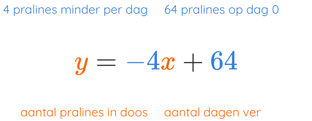 Er zitten oorspronkelijk pralines in de doos en er gaan er iedere dag uit. Het aantal pralines dat op een bepaalde dag nog in de doos zit, is dus gelijk aan min het aantal dagen maal :