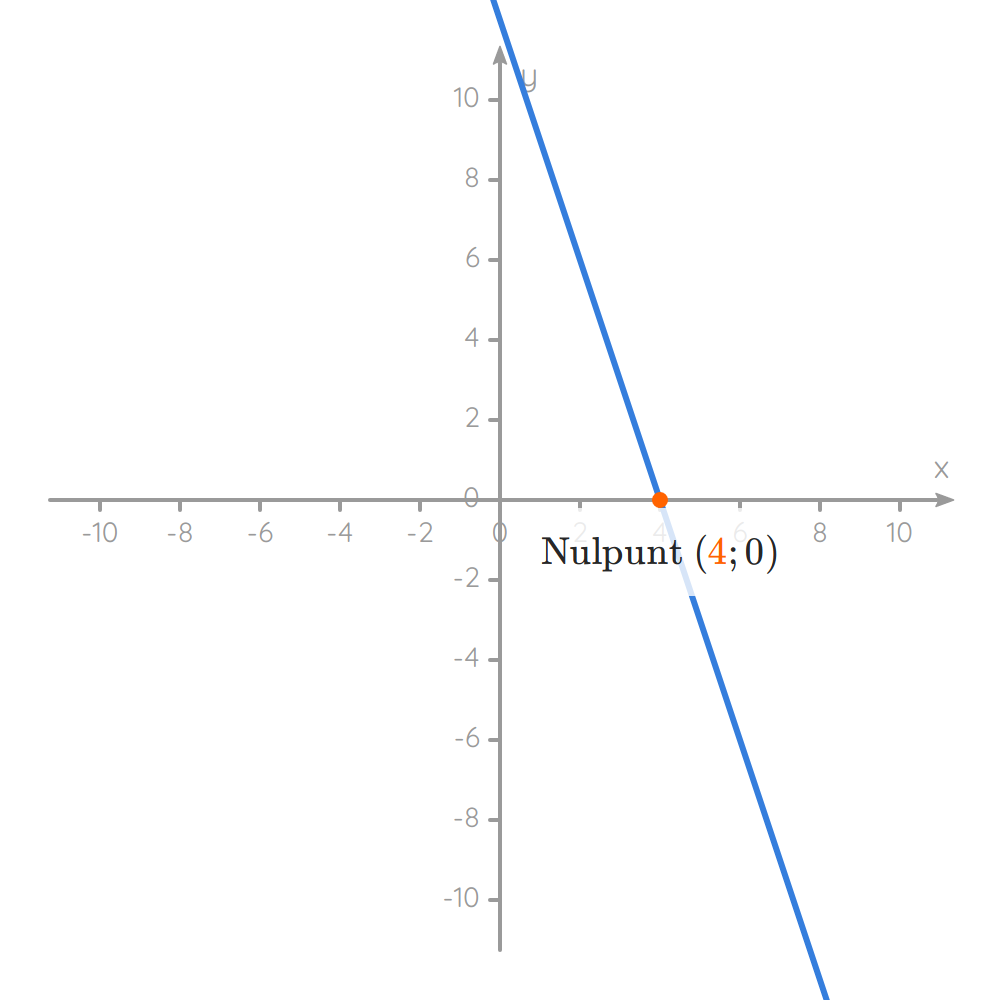 We weten dat de grafiek van een eerstegraadsfunctie een rechte is. Die rechte snijdt de x-as exact één keer. Dit snijpunt is het nulpunt van de functie. Hieronder zie je bijvoorbeeld de grafiek van met het nulpunt aangeduid.