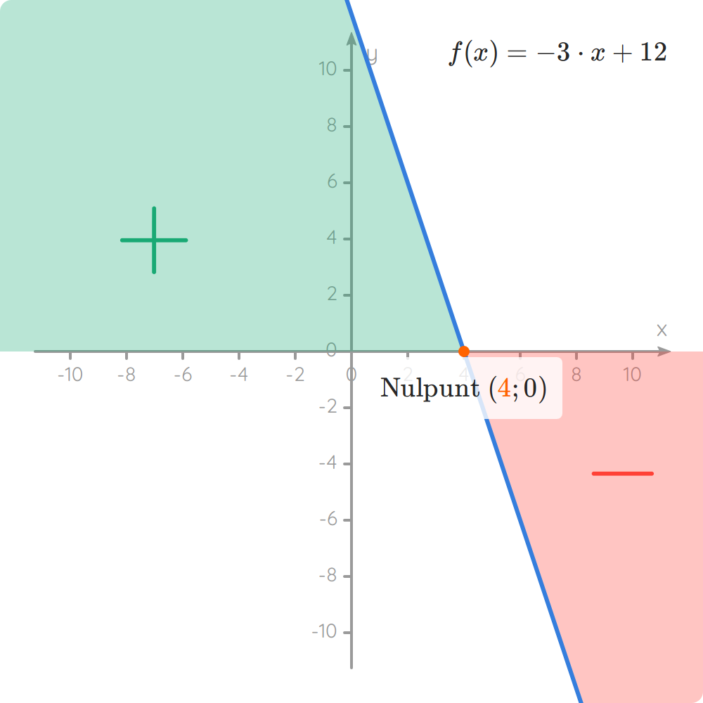 Omdat de rico () van de functie kleiner is dan nul, daalt de grafiek. We zien dat de grafiek vòòr het nulpunt boven de x-as liggen en na het nulpunt onder de x-as. Vòòr het nulpunt hebben we dus positieve functiewaarden en na het nulpunt hebben we negatieve functiewaarden.