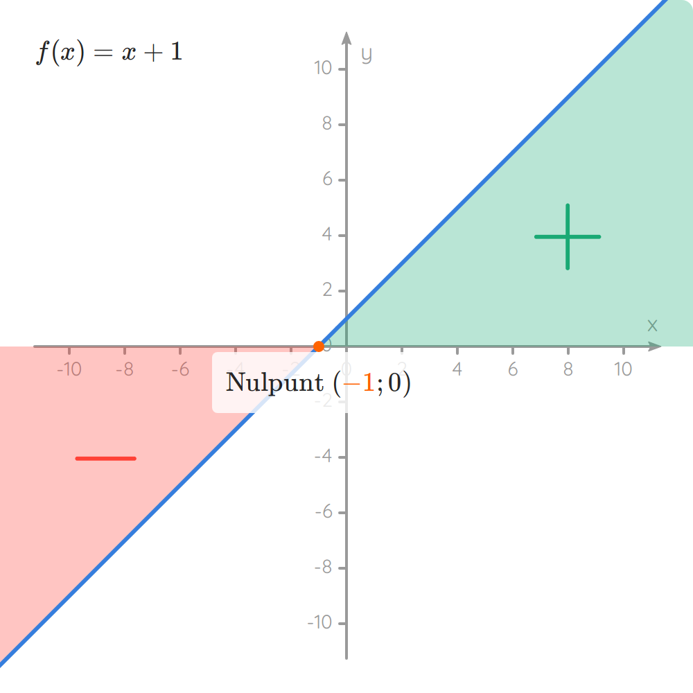 Wanneer groter is dan nul, dan zal de grafiek van de functie stijgen en dan zal de grafiek vòòr het nulpunt onder de x-as liggen en na het nulpunt boven de x-as. Vòòr het nulpunt hebben we dus negatieve functiewaarden en na het nulpunt hebben we positieve functiewaarden.