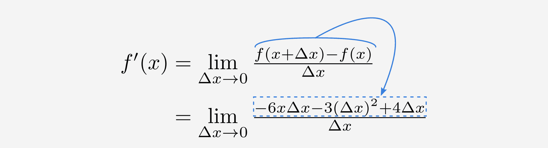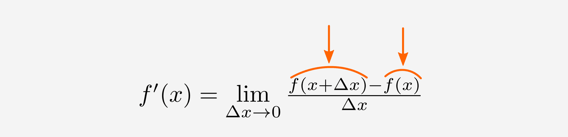 En zo hebben we de definitie van de afgeleide functie van ! 🙌 Als we naar die definitie kijken, zien we dat er twee keer iets met staat. De eerste keer staat er en de tweede keer staat er :