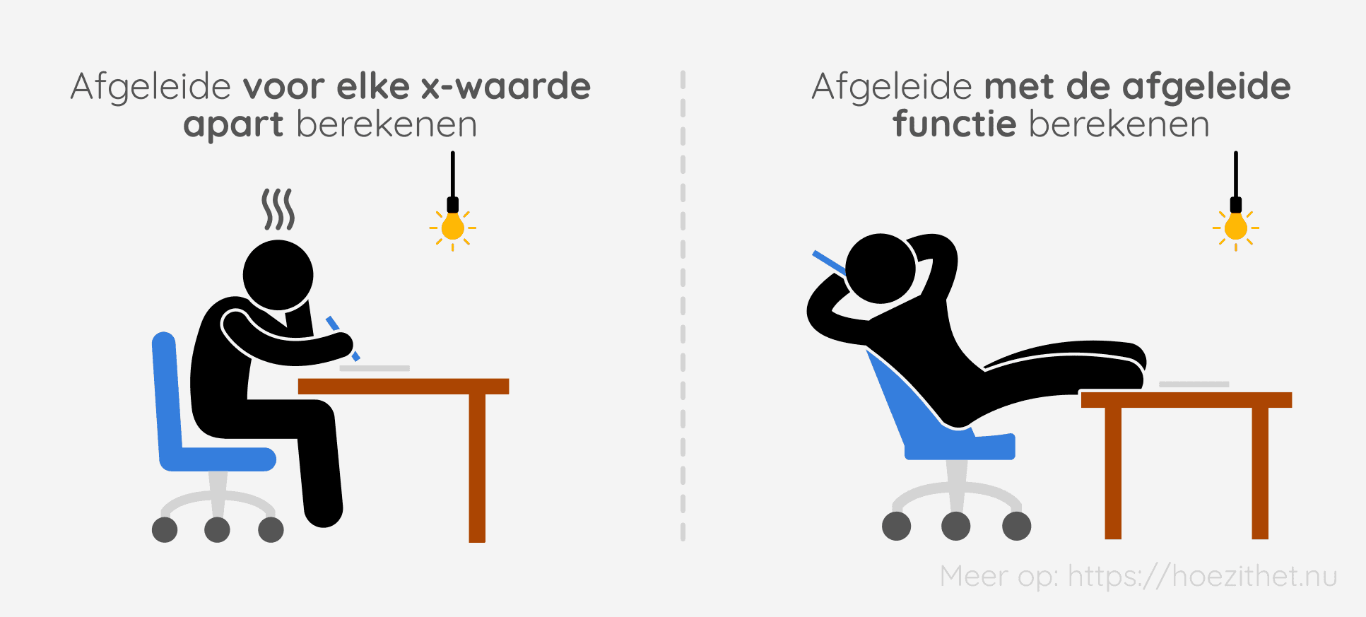 Eens we de afgeleide functie hebben gevonden, kunnen we snel afgeleiden vinden in verschillende x-waarden. Maar we moeten toegeven dat het vinden van de afgeleide functie zelf wel nog steeds flink wat werk was. Gelukkig bestaan er voor heel wat functies binnenwegen om in één oogopslag de afgeleide te vinden. Hier leren we later meer over!