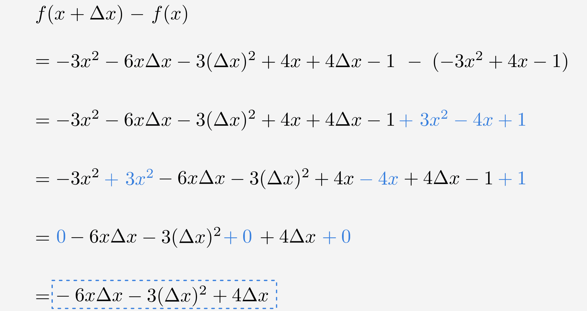 Die blijft een serieus harige uitdrukking... 🙄 Als je terug even naar boven gaat, zie je in de definitie van in de teller van de breuk "" staan. We moeten van onze dus nog aftrekken. Gelukkig vallen er dan een hele hoop dingen weg: