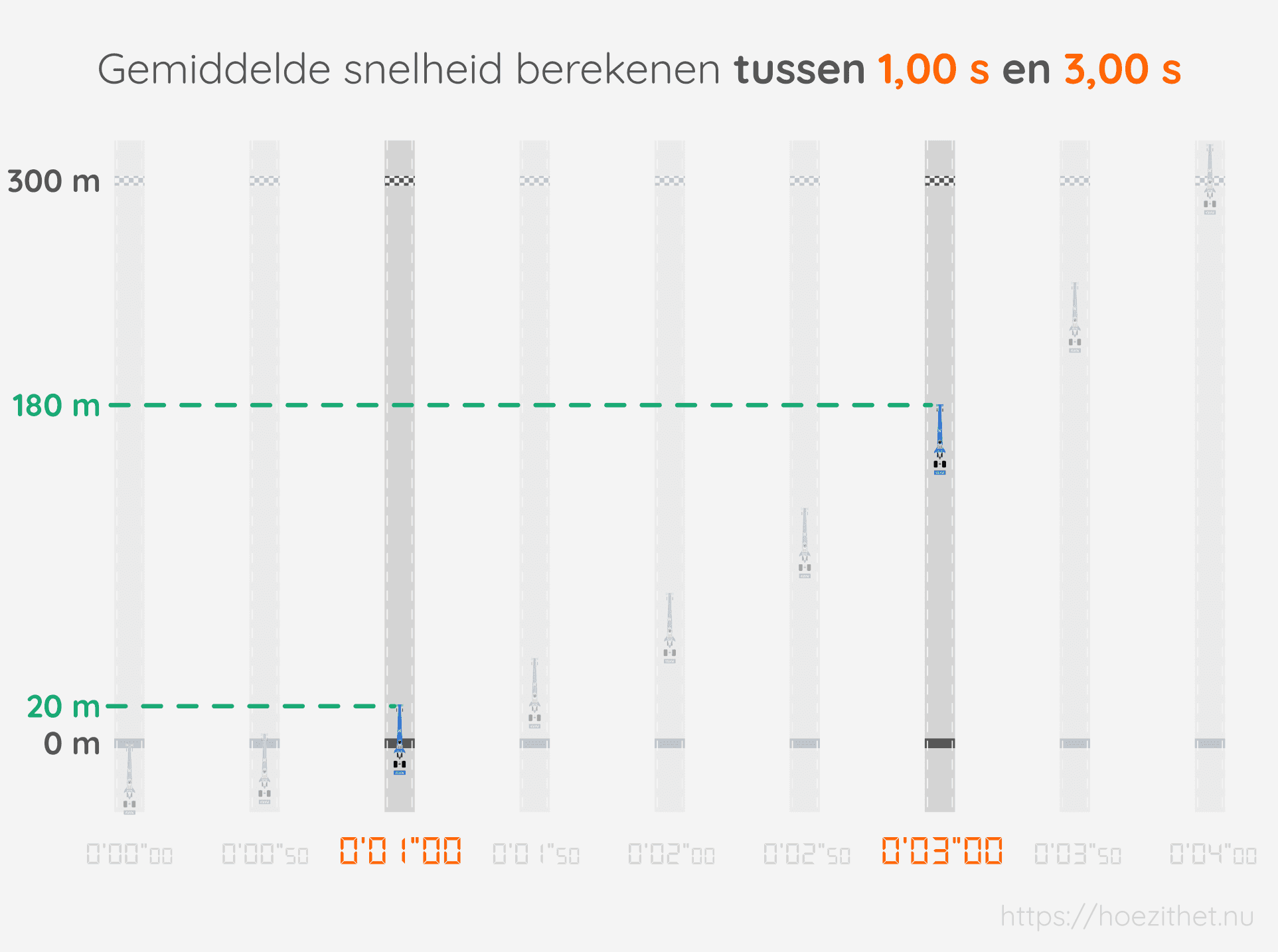 Je ziet dat we voor de afgelegde afstand en de tijd die nodig was telkens een verschil berekenen. Voor de afstand is dat het verschil tussen de tweede positie () en de eerste positie (). Voor de tijd is dat het verschil tussen de tweede tijd () en de eerste tijd (). Die twee verschillen zetten we vervolgens in een breuk met in de teller (boven) het verschil van posities en in de noemer (onder) het verschil van tijden. We kunnen de formule voor gemiddelde snelheid dus ook als volgt schrijven: