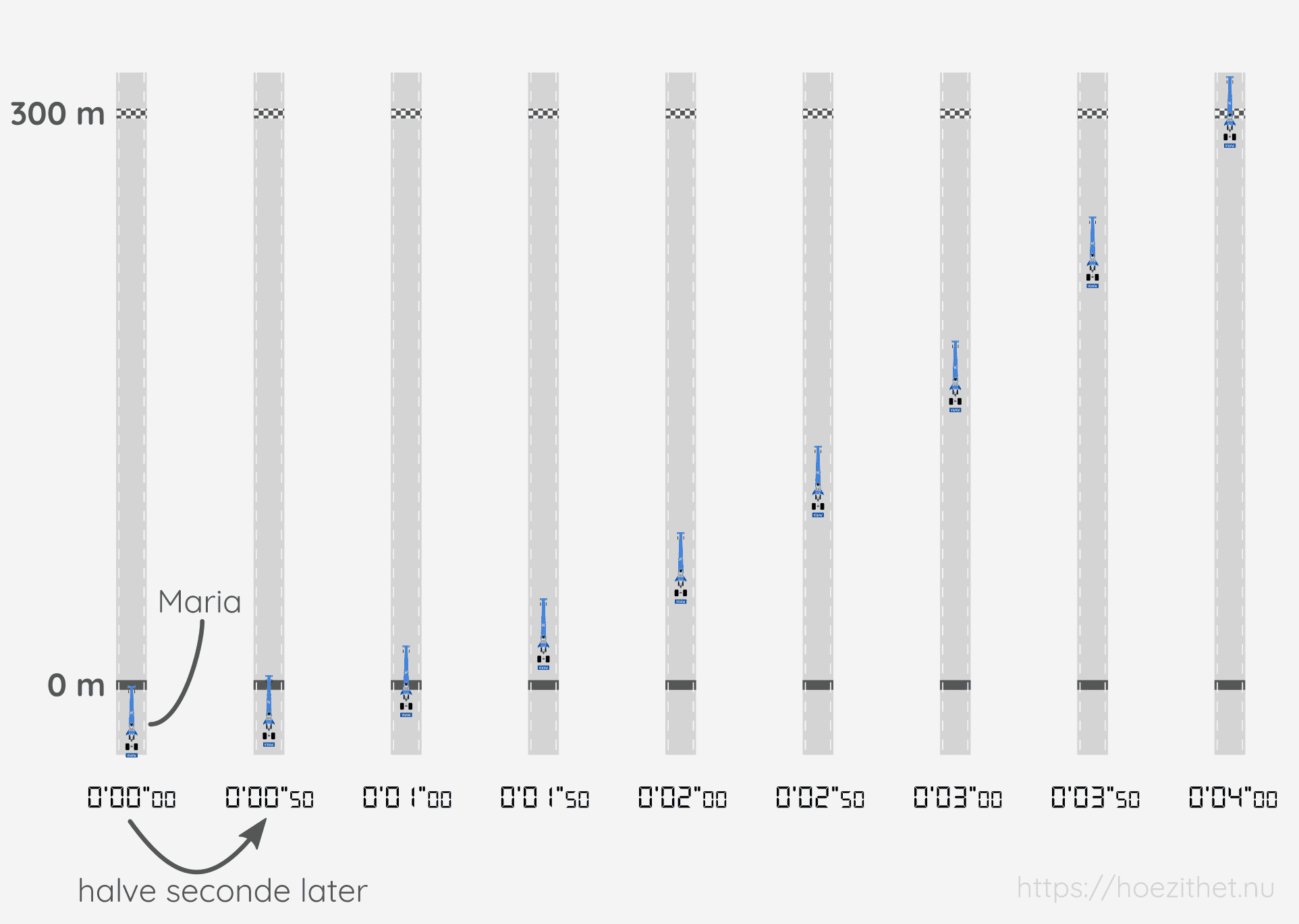 Maria houdt van dragracen. Bij een dragrace vertrekken twee wagens vanuit stilstand en racen ze in een rechte lijn. De eerste aan de finish wint.