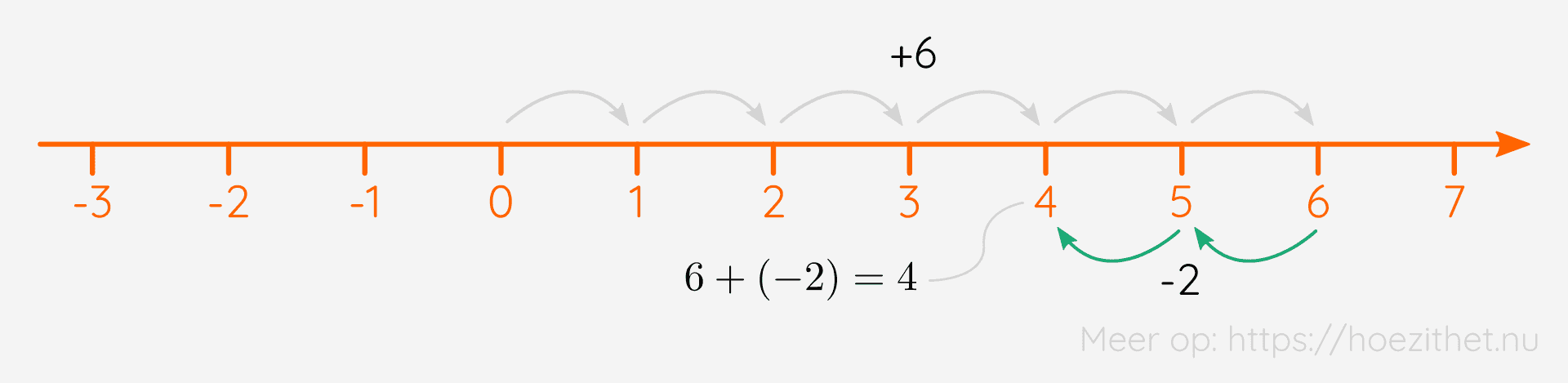 In de verzameling van de gehele getallen zitten er ook negatieve getallen. Hoe kunnen we die optellen? Een negatief getal optellen, betekent op onze getallenas dat we dat aantal stappen naar links zetten, in plaats van naar rechts. Zo krijg je wanneer je en optelt. Je gaat eerst zes stappen naar rechts en dan twee stappen naar links, door het minteken voor de .