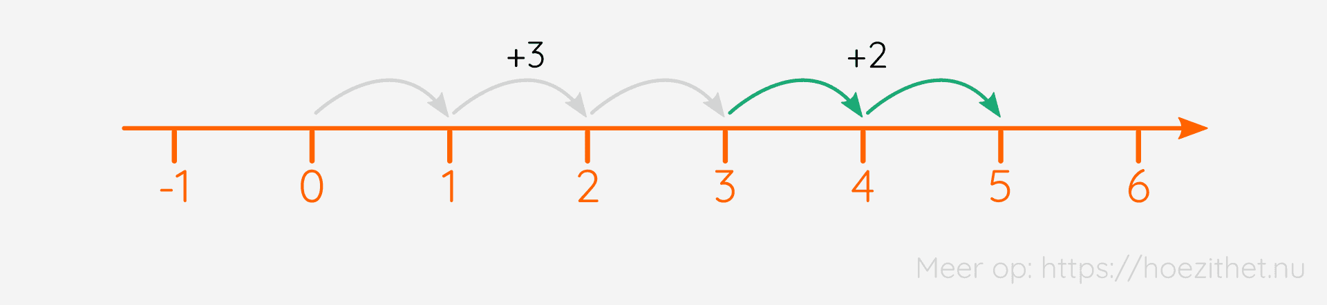 Een optelling kunnen we visueel voorstellen op een getallenas. We beginnen op de van de getallenas en telkens we een optelling tegenkomen, zetten we een aantal stappen. Wanneer je bv. vanaf de drie stappen naar rechts gaat en je daarna nog eens twee stappen naar rechts gaat, kom je uit op de van de getallenas. We kunnen dit schrijven als de som .