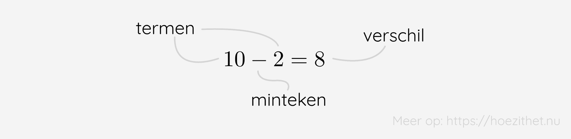 De onderdelen van een aftrekking noemen we, net als bij een optelling, de termen. Tussen die termen noteren we een minteken en de uitkomst van de aftrekking is het verschil.