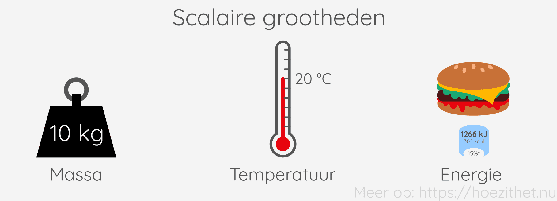 We noemen temperatuur en massa daarom scalaire grootheden. Ze hebben enkel een getalwaarde (scalar = getal). We kunnen geen vectoren gebruiken om de grootheden te beschrijven.